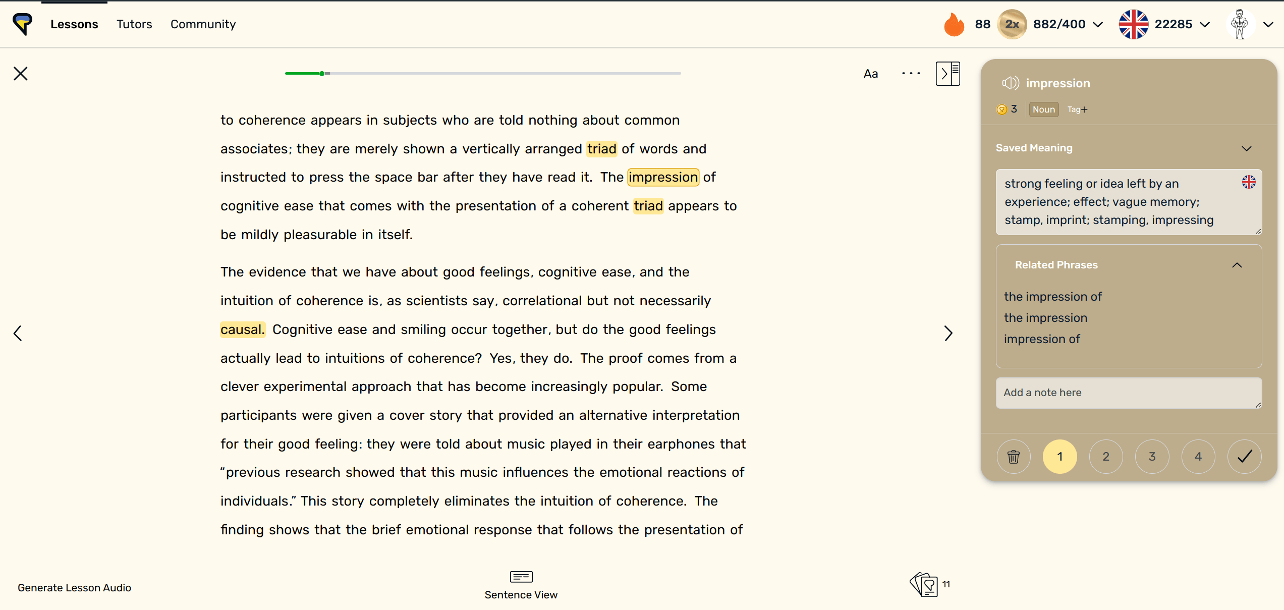 - 进度可视化:LingQ 清晰的展示每日阅读量、已掌握的词汇量和阅读速度等数据